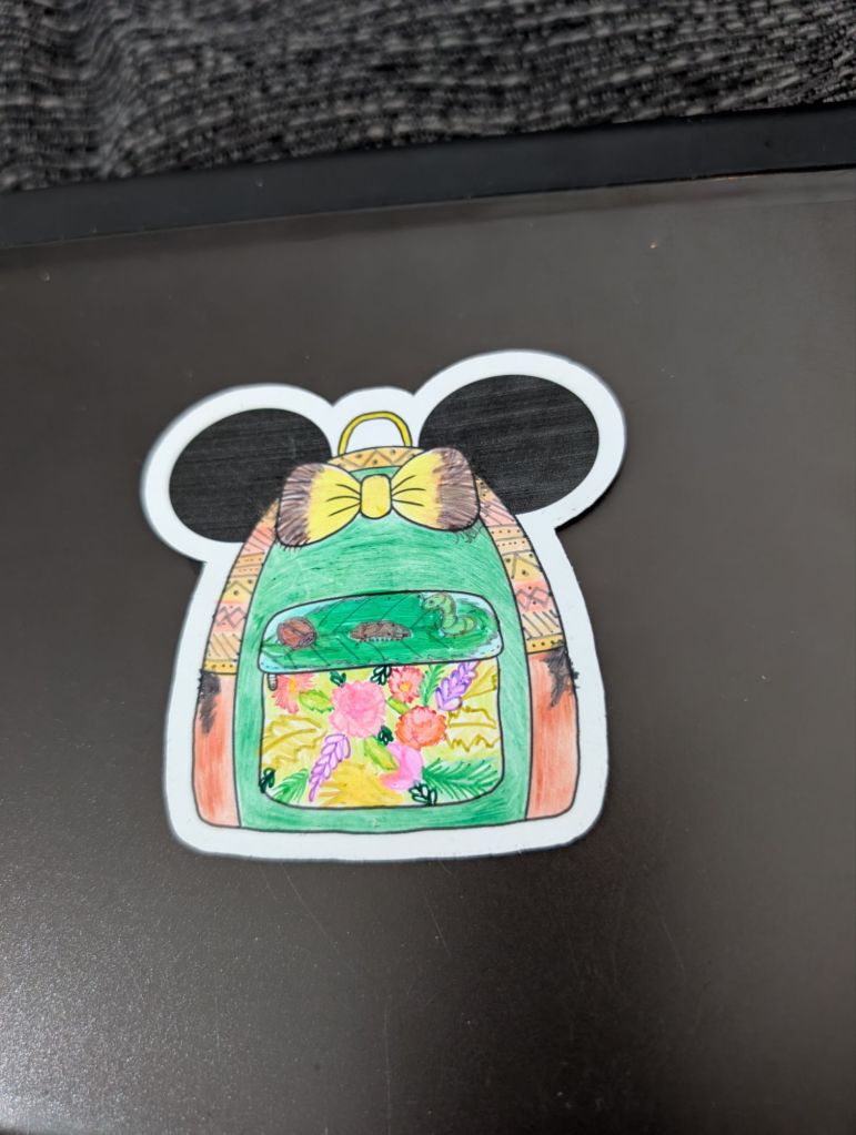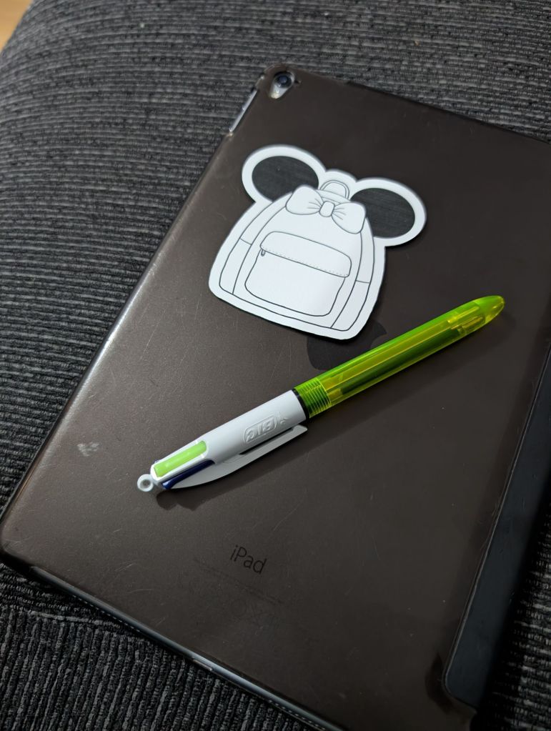 The design is something you’d instantly recognise if you’re a Disney park lover—a little rucksack with mouse ears. But here’s the twist: it’s a colouring-in sticker. That means it’s for everyone, no matter your style or favourite characters. You get to bring it to life with your own colours, your own imagination. And I’m already working on new designs, including a paperclip-inspired one that ties in perfectly with this blog post.